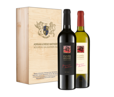 Weil das Beste gerade gut genug ist. Auch und besonders als Geschenk. Und so überreichen Sie in dieser schönen 2er Holzkiste gleich fünffache Schweizermeister! Die beiden preisgekrönten Assemblagen Cuvée Madame Rosmarie Mathier weiss und Cuvée Madame Rosmarie Mathier rot (je 75cl) sind wahre Geschmacksveredler und Passepartouts zu diversen Gerichten, mit denen Sie grosse Freude und noch grössere Genussmomente schenken.